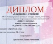 Приняв участие в Международном фестивале-конкурсе  детских, юношеских, молодежных, взрослых творческих коллективов и исполнителей «АДМИРАЛТЕЙСКАЯ ЗВЕЗДА»- «ВИВАТ КАЗАНЬ 2021» ученица ДШИ Лукманова Лиана стала обладателем звания ЛАУРЕАТА 1 СТЕПЕНИ. Международный фестиваль-конкурс детских, ...